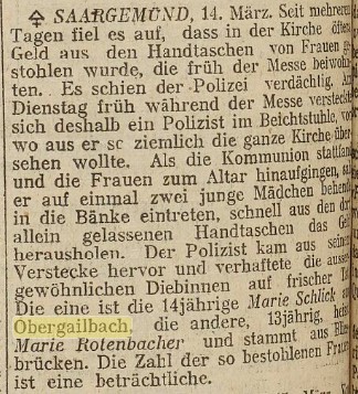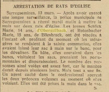 Vols à l'église, articles parus dans Le Messin "Arrestation de rats d'église" le 14 mars 1923 et dans Strassburger neueste Nachrichten : General-Anzeiger für Strassburg und Elsass-Lothringen le 17 mars 1923