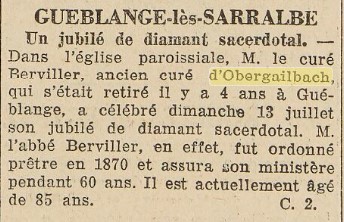 La nomination de Jean Berviller, paru dans Le Lorrain le 24 septembre 1910. Article du 16 juillet 1930 paru dans le Messin "Un jubilé de diamant sacerdotal"