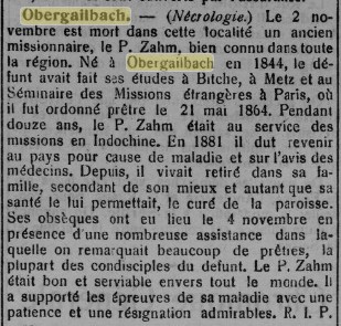 P. Zahm, missionnaire : article du « Le Lorrain : écho de Metz et d’Alsace-Lorraine : journal politique, religieux, littéraire, agricole et commercial » paru le 12/11/1908