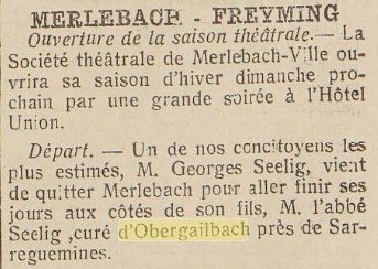 L'Abbé Jean Seelig : articles parus dans Le Messin : son départ de Moyeuvre-Grande paru dans Le Messin le 6 octobre 1934 et l'arrivée de son père paru le 25 octobre 1934.