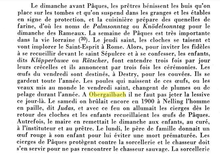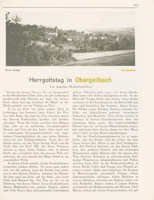 Extrait du livre "Elsassland Lothringer Heimat" de 1938 : article "Herrgottstag in Obergailbach" écrit par Angelika Merkelbach-Pinck : page 315 et 316
