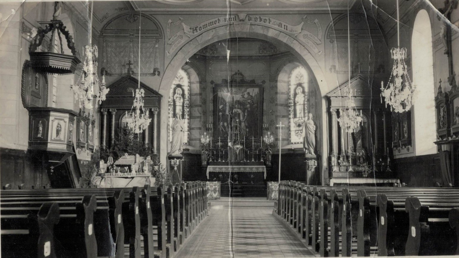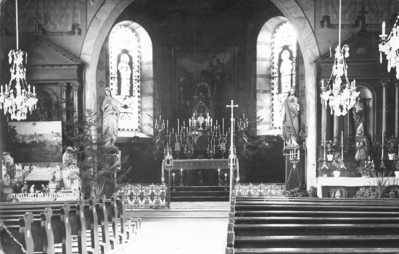 Les verrières du chœur sont signées H. Heyden et sont datées de 1944 : photos de celle de gauche et de celle de droite, ainsi qu'une vue d'ensemble datée d'avant la 2nde Guerre Mondiale
