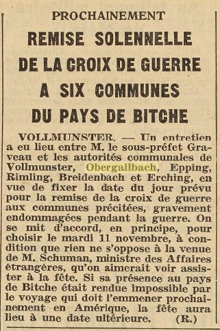 "Des communes sinistrées à l'honneur" paru le 26 juillet 1951" dans les Dernières Nouvelles d'Alsace.