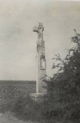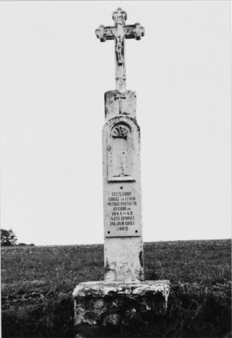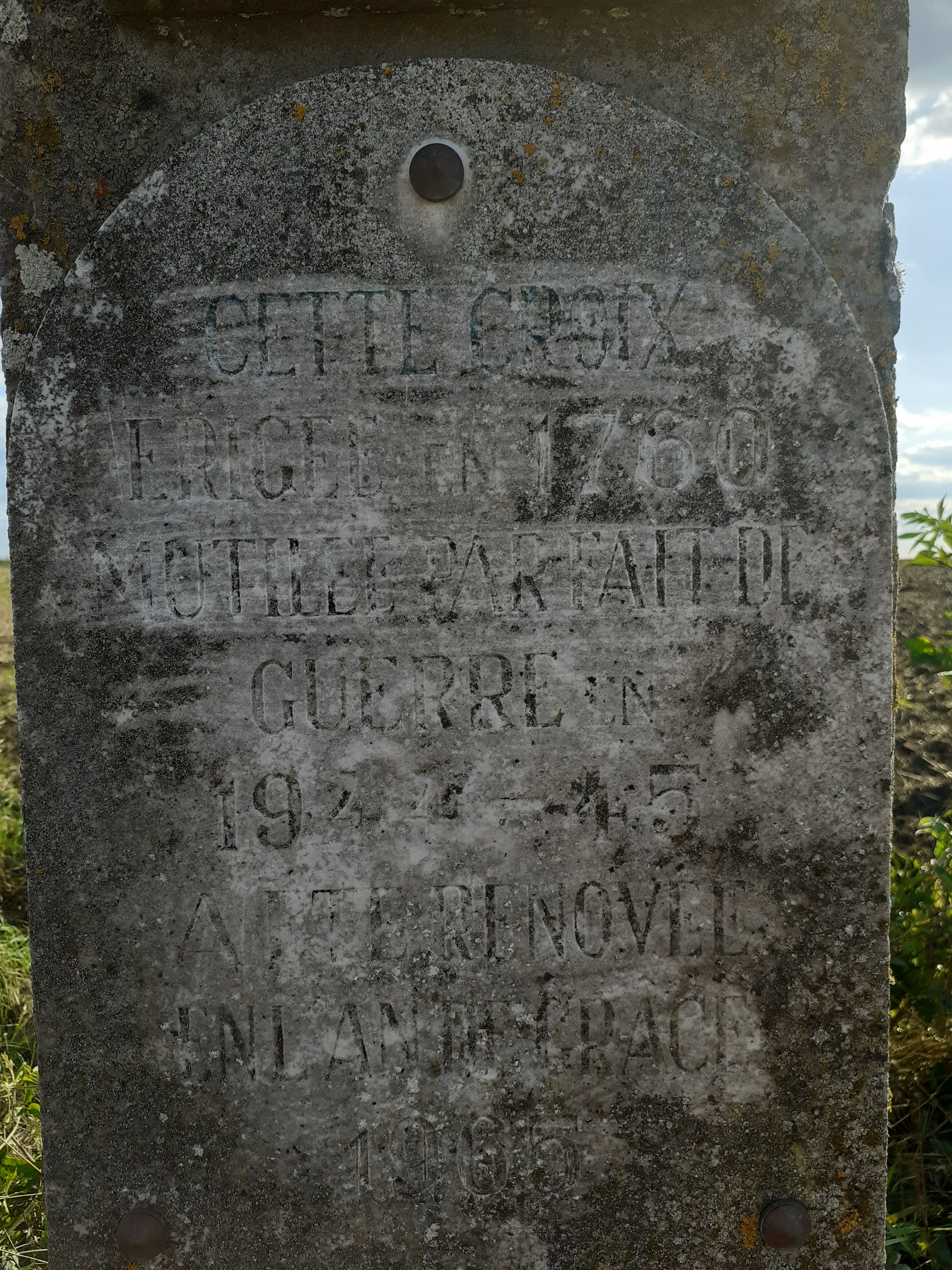 On peut y lire "Cette croix érigée en 1760, mutilée par fait de guerre en 1944-45, a été rénovée en l'an de grâce 1965"